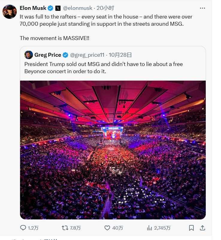特朗普的这场集会人气极高,麦迪逊广场花园的2万个座位座无虚席,场外还聚集了大批支持者。据马斯克表示,场馆周围的街道上站满了超过7万人,表达了对特朗普的支持。