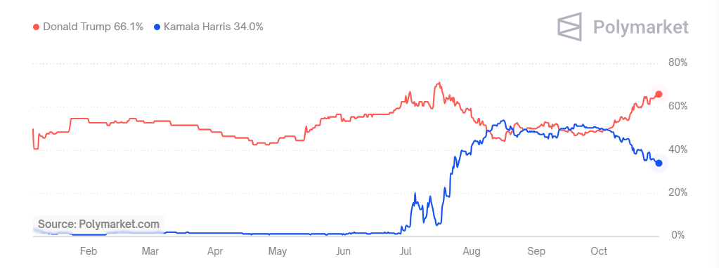 尽管民调显示特朗普与其民主党竞选对手哈里斯的支持率相差无几,但多个博彩网站显示特朗普的胜算正在提升。例如,博彩平台Polymarket的数据显示,自10月初以来,市场押注特朗普胜选的概率持续上升,目前该平台认为特朗普的胜算为66%,而哈里斯仅为34%。