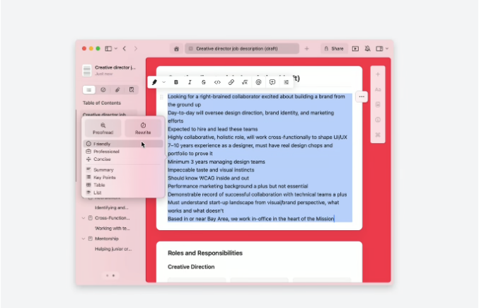 用户可以选择文本并让AI以“专业、简洁或友好”的语气进行改写。同时,AI还能在PPT中将一段文字总结成数条要点,并提供一键总结归纳、文本校对及用词和文本结构建议。
