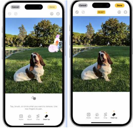 在“照片”应用中,AI不仅提升了文字搜索功能的智能性,还引入了全新的清理工具,用户可以通过选中图片中不想要的人物或物体,实现一键去除。