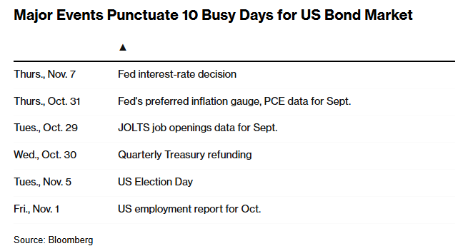 这十天充满变数,关键新闻事件可能加剧债市抛售,尤其是在投资者为美国大选做准备时。交易员正为防范美债收益率飙升的期权支付高额溢价。