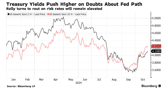 过去一个月,美债价格大幅下滑,因美国经济持续强劲引发对美联储降息能力的质疑。大选临近更添市场不确定性,特朗普若胜选,其减税和关税政策可能加剧通胀,推高美债收益率。
