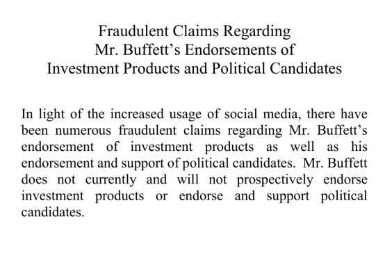 10月23日周三早间,伯克希尔·哈撒韦公司在其官方网站上正式发布声明,明确指出沃伦·巴菲特不会为任何投资产品或政治候选人背书。声明详细指出:“鉴于社交媒体使用的日益普及,关于巴菲特先生代言投资产品或支持政治候选人的欺诈性指控不断涌现。在此,我们郑重声明,巴菲特先生目前不会代言任何投资产品,且在未来也不会支持或代言任何政治候选人。”