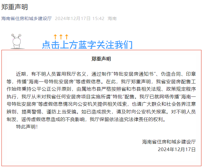12月17日,海南省住房和城乡建设厅正式对外发布了一则重要声明。声明中指出,近期,有部分不明身份的人员擅自冒用该厅的名义,通过制作所谓的“特批安居房通知书”,以及伪造合同、印章等手段,在网络上广泛传播关于“海南一号特批安居房”的虚假信息。