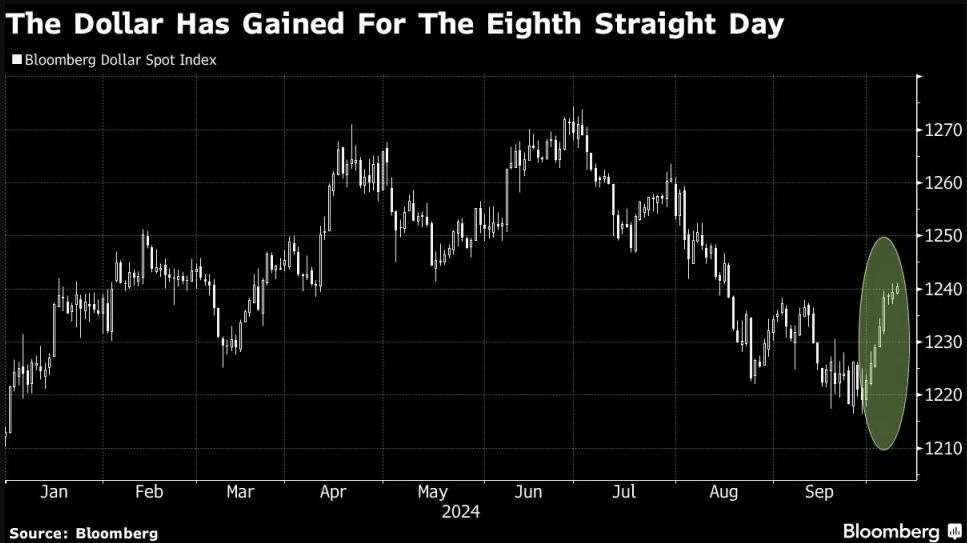 这一系列变化引发了全球金融市场的显著转变。10年期美债收益率升破4%,强势美元也在过去一周多的时间里显著复苏。ICE美元指数触及八周来的最高位,彭博美元综合指数更是连续八个交易日上涨,创下了自2022年4月以来最长的连续上涨势头。