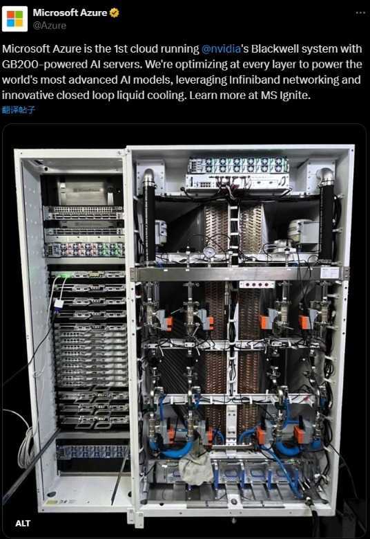 与此同时,科技巨头微软旗下的Azure云服务也在周二宣布,公司已成功部署了配备GB200芯片的服务器。Azure强调,作为全球首个采用Blackwell系统的云服务提供商,其新款服务器还搭载了Infiniband互联技术和创新闭环液冷技术,展现了强大的技术实力。