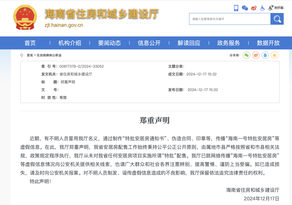 海南省住房和城乡建设厅发布声明,揭露近期网络上流传的“海南一号特批安居房”为虚假信息,强调安居房配售工作公平公正公开,呼吁提高警惕避免上当受骗。
