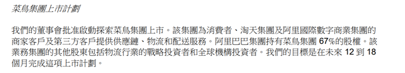 菜鸟已被确认为阿里计划上市的三大子集团之一,上市计划已启动,预计在未来12至18个月内完成。目前,阿里巴巴集团持有菜鸟集团67%的股权。