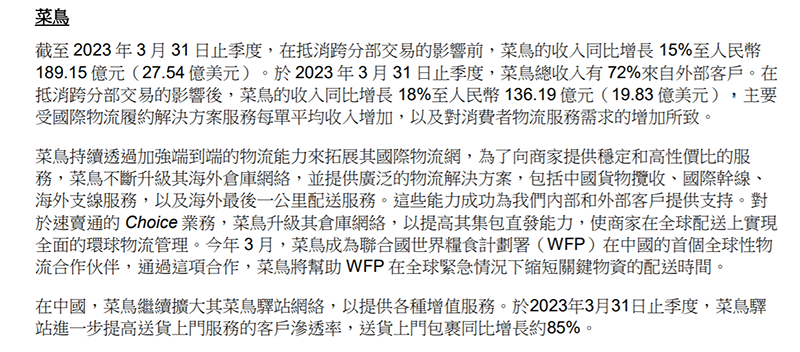 阿里财报数据显示,菜鸟收入(2023年Q1)同比增长18%至136.19亿元。在国际端到端履约网络、国内送货上门等关键物流能力建设方面,菜鸟持续推进并取得明显进展。