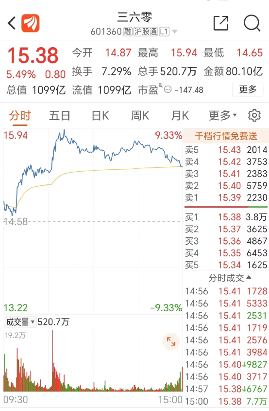 发布会当天,三六零股价上午大涨超9%,但午后有所回落,最终收盘上涨5.49%,市值达到1099亿。