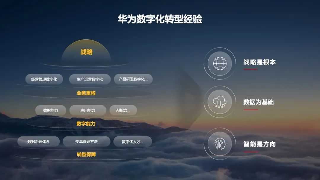 在数字化转型的实践中,华为注重数据治理的基础作用,通过数据集成与匹配、数据汇聚与共享等方式,实现数据的科学治理和价值创造。同时,华为还积极推动数据智能的发展,实现作业数字化、数字平台化、平台智能化、智能实战化,为企业数字化转型提供有力支持。