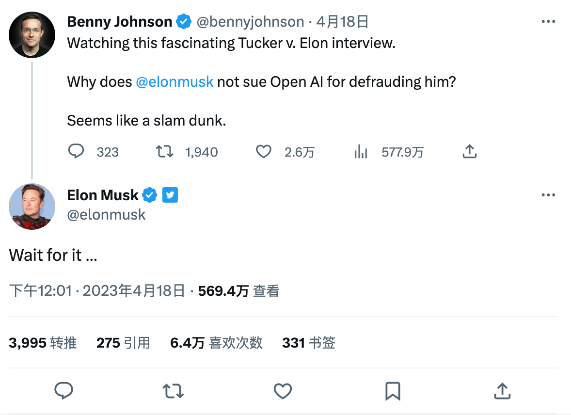 播客主持人本尼·约翰逊(Benny Johnson)在推特上询问马斯克为何不“起诉Open AI欺诈”他时,马斯克回复:“等着瞧……”。这一回应迅速在网络上发酵,网友们纷纷猜测马斯克或将对人工智能巨头OpenAI提起诉讼。