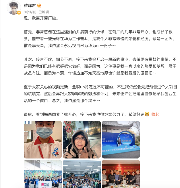 华为“天才少年”稚晖君离职,开启新事业征程