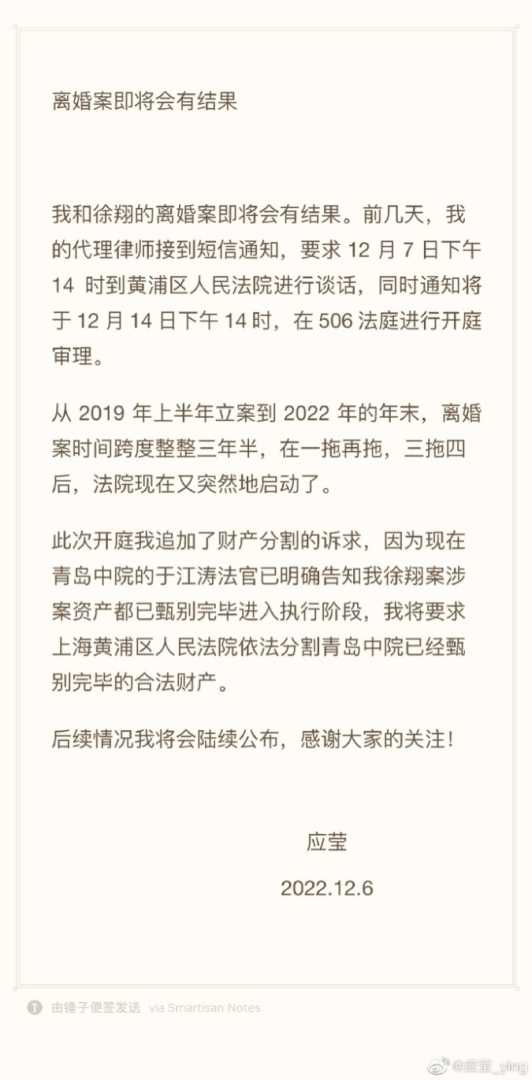 应莹今日通过其微信公众号发布消息称,其与徐翔的离婚案即将迎来新的进展。据其透露,前几日,她的代理律师收到黄浦区人民法院的短信通知,要求于12月7日下午14时前往法院进行谈话,并定于12月14日下午14时在506法庭开庭审理此案。值得注意的是,应莹在本次开庭中追加了财产分割的诉求。