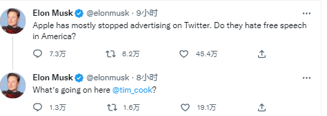 马斯克在推特上表示,苹果已基本上停止在推特上投放广告,并质疑苹果是否反对美国的言论自由。他@苹果CEO蒂姆·库克追问原因,并转发了多条关于苹果言论审查、垄断及收取“30%秘密税”的推特。他还嘲讽苹果在政治立场上偏袒民主党,称苹果因推特允许言论自由而必须扮演执法者角色。