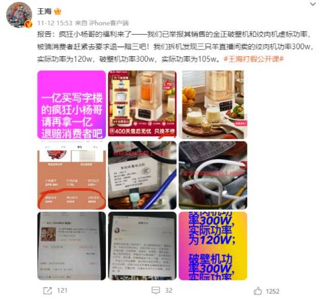 11月12日,王海发布微博,并晒出拆机照片显示,三只羊直播间售卖的绞肉机标注功率300w,实际功率为120w;破壁机标注功率300w,实际功率为105w。随后,相关产品从“金正小家电旗舰店”下架,客服回应称原因为“暂时无货”。