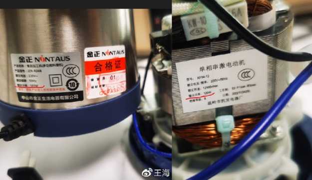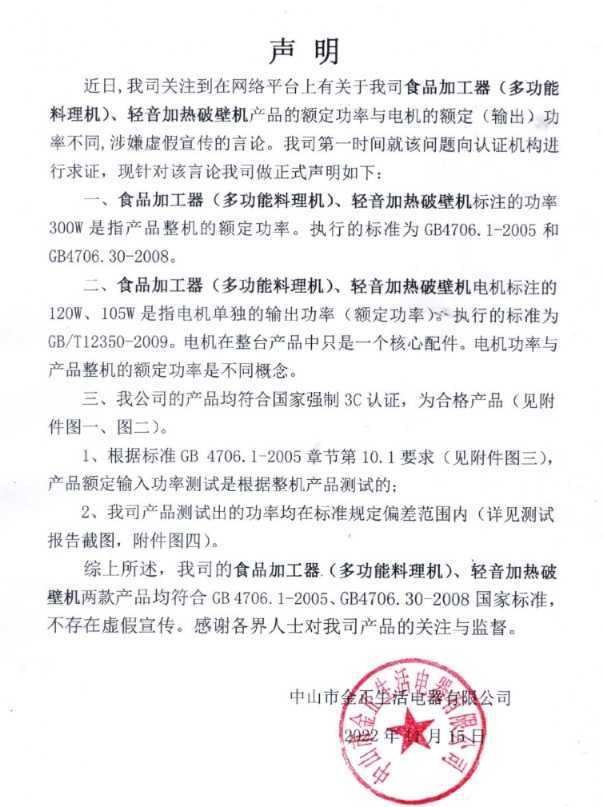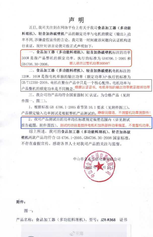面对质疑,金正生活电器发布声明回应,称两款产品的整机额定功率标注为300W,而电机单独输出功率分别为105W和120W,均符合国家标准,不存在虚假宣传,并提供了相关认证证书和第三方机构检测证明。