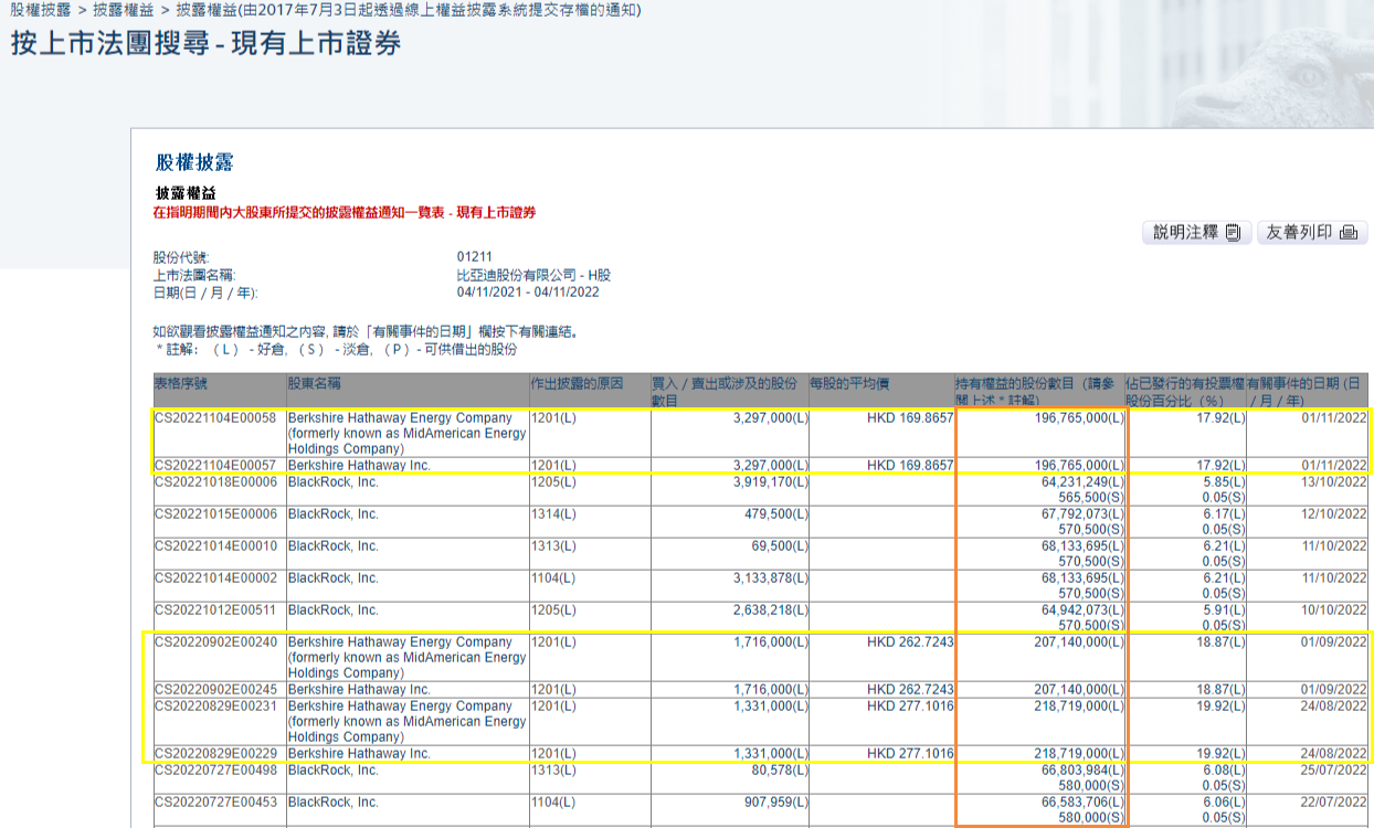 11月,港交所数据显示,股神巴菲特再次减持比亚迪。11月1日,伯克希尔哈撒韦公司以169.87港元均价卖出329.7万股比亚迪H股,持股比例降至17.92%,套现约5.6亿港元。此前已多次减持,累计套现约66亿港元。