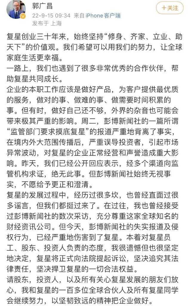 郭广昌在微博上表示,彭博新闻社的失实报道及侵权行为,已经严重地伤害到了复星集团的声誉和利益。他强调,本着对复星员工、股东、投资人负责的态度,复星将正式向法院提起诉讼,坚决追究彭博新闻社的法律责任,捍卫复星的一切合法权益。