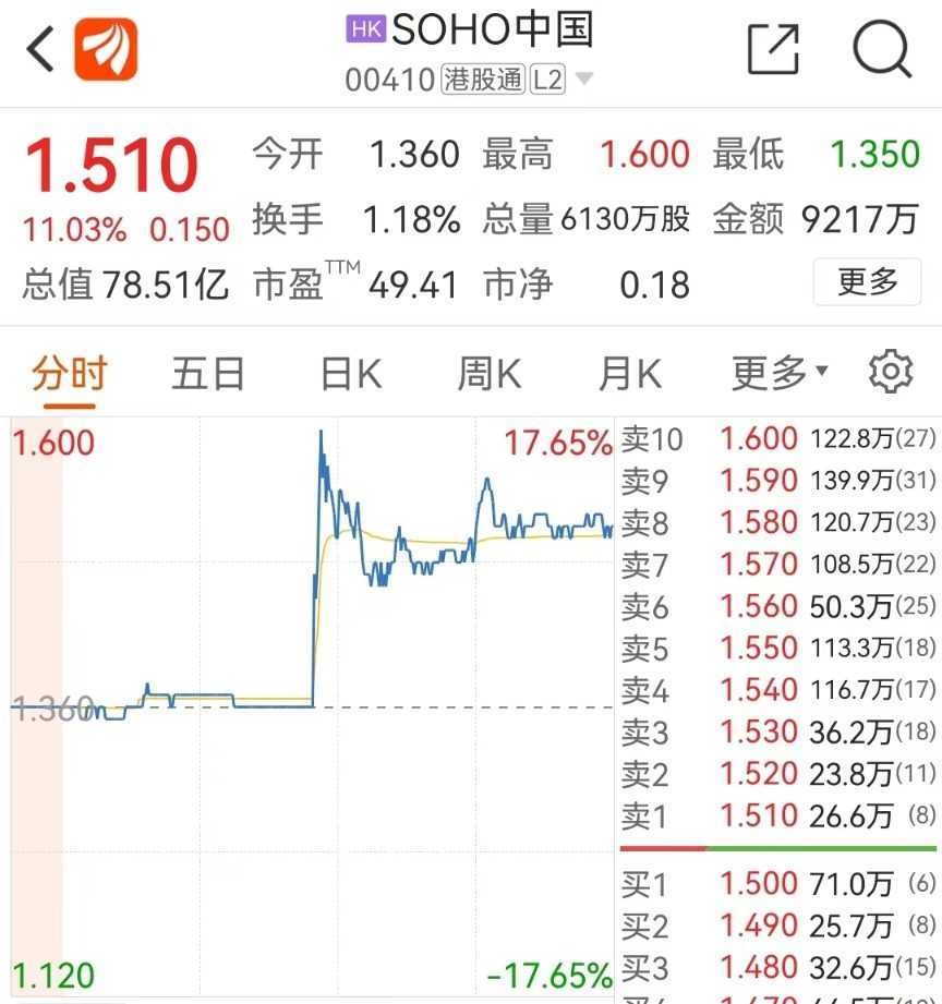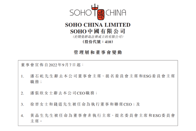 9月7日,SOHO中国在港交所发布公告,宣布潘石屹已辞去董事会主席、提名委员会主席和ESG委员会主席的职务,潘张欣也已辞去公司行政总裁(CEO)的职务,他们均表示将专注于支持艺术和慈善事业。这一消息引发了市场广泛关注,SOHO中国股价瞬间飙涨近17%,随后稍有回落,截至当日收盘,涨幅达11.03%。