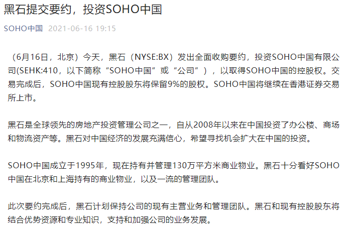 在财务方面,SOHO中国上半年实现营业收入约8.96亿元,同比增长11%,毛利约7.42亿元,同比增长约13%,租赁业务毛利率达到83%。然而,去年潘石屹曾计划将公司出售给黑石集团,交易金额高达236亿港元,但因反垄断审查而告吹。
