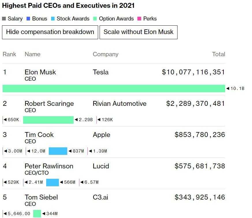 榜单上,紧随马斯克之后的是电动汽车Rivan的CEO罗伯特·斯卡林格,薪酬为22.9亿美元。苹果CEO蒂姆·库克以8.53亿美元的薪酬位列第三,电动汽车Lucid的CEO彼得·罗林森和软件公司C3.ai的CEO汤姆·希伯分别以5.76亿美元和3.44亿美元的薪酬紧随其后。