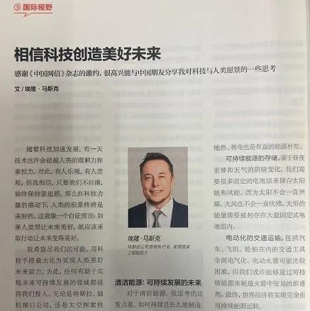 日前,国家互联网信息办公室主管的《中国网信》杂志刊登了特斯拉CEO马斯克的署名文章,题为《相信科技创造美好未来》。马斯克在文章中展望了未来交通工具的全面电气化,并深入探讨了可持续能源、人形机器人、脑机接口及太空探索等多个领域的愿景。