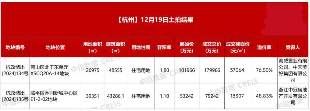 杭州两宗住宅用地出让,溢价成交刷新纪录