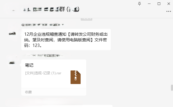 近期,国家计算机病毒应急处理中心与计算机病毒防治技术国家工程实验室,依托国家计算机病毒协同分析平台(https://virus.cverc.org.cn),再次在我国境内捕获到“银狐”木马病毒的最新变种。攻击者利用伪造的财务、税务违规稽查通知等钓鱼信息,通过微信群散播含有木马病毒的加密压缩包文件。这些文件以“笔记”等字样命名,指向如“违规-记录(1).rar”等压缩包,解压后会发现名为“开票-目录.exe”、“违规-告示.exe”等可执行程序,实为木马病毒新变种。