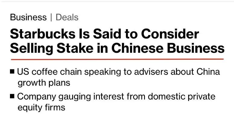 11月21日,市场传言星巴克正深入探讨其中国业务的未来路径,其中包括可能出售业务股份的选项,并已非正式地评估了包括中国本土私募股权机构在内的多个潜在投资者的兴趣。一张市场流传的图片显示,星巴克正在考虑出售中国业务的股份。