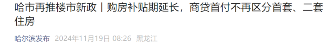 此外,哈尔滨于11月19日发布了稳楼市新政,提出延长购房补贴期限至2025年12月31日,并降低首套、二套房商贷首付比例至15%。多子女家庭购房公积金贷款额度上浮30%,同时取消商品房销售价格限价机制,旨在进一步促进房地产市场平稳健康发展。