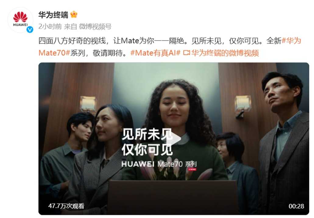 此外,华为Mate品牌盛典将于11月26日14:30举行,届时Mate70系列将正式亮相。今日发布的三个宣传视频,也是华为在官宣Mate70发布日期后,首次公开的一系列功能前瞻。