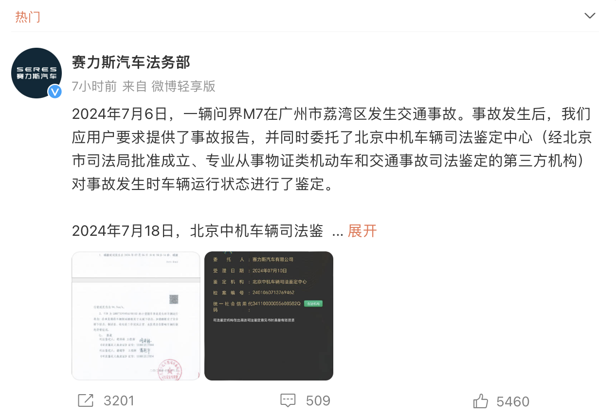针对7月广州问界M7事故数据和结论被指人为修改的传闻,赛力斯再次发布官方声明进行回应。