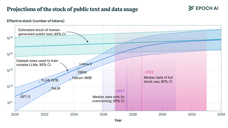 Meta AI人工智能研究院(FAIR)的田渊栋指出,随着模型性能接近人类水平,新数据的获取变得愈发困难,模型改进空间逐渐缩小,最终将难以解决某些边角案例。非营利研究机构Epoch AI的论文也预测,未来数年内,数据增长速度将无法支撑AI大模型的扩展,可能在2026至2032年间耗尽。