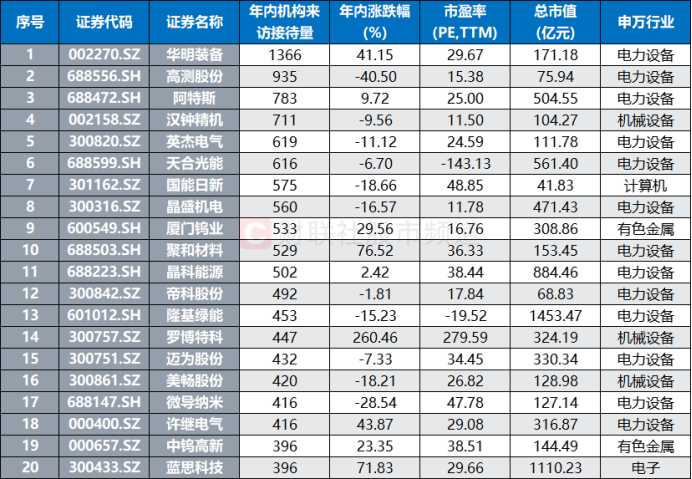 注:年内机构调研量居前的光伏概念股(数据截至11月7日收盘)