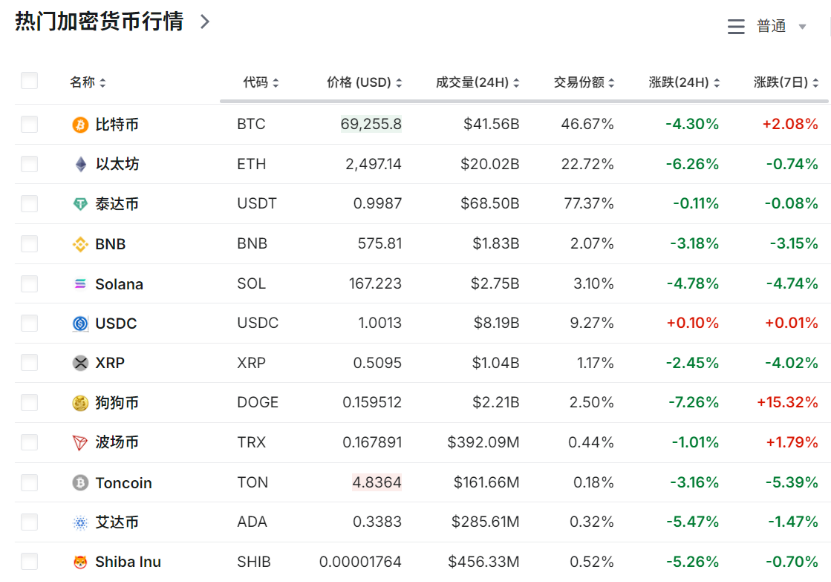 具体数据显示,比特币在过去24小时内下跌近3400美元,跌幅超过4%,价格从7.26万美元滑落至6.92万美元。以太坊、狗狗币、BNB、Solana和艾达币等虚拟货币同样出现下跌,跌幅分别超过6%、7%、3%、5%和5%。