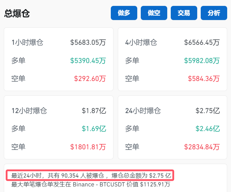 根据Coinglass的数据,过去24小时内,虚拟货币市场爆仓人数激增,总金额达到2.75亿美元,其中多单爆仓金额为2.46亿美元,空单爆仓金额为2834万美元。