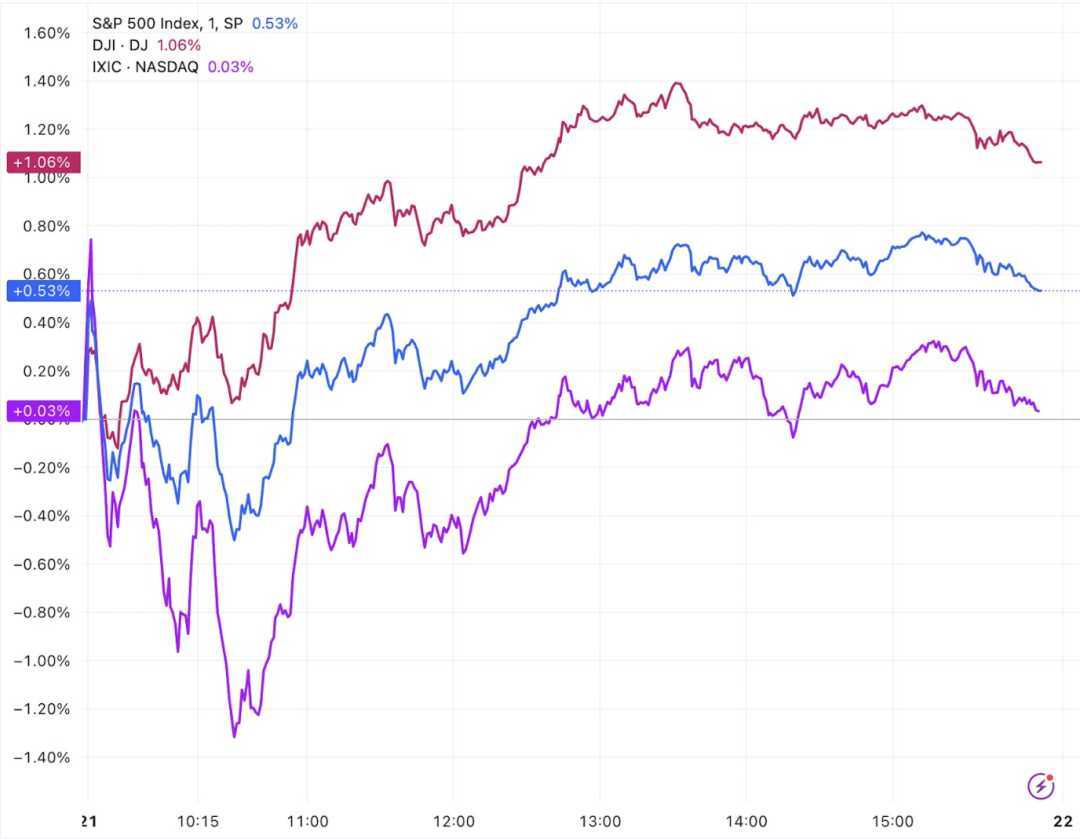截至收盘,道琼斯指数报43,870.35点,涨幅达1.06%;标普500指数报5,948.71点,上涨0.53%;纳斯达克指数则微涨0.03%,报18,972.42点。