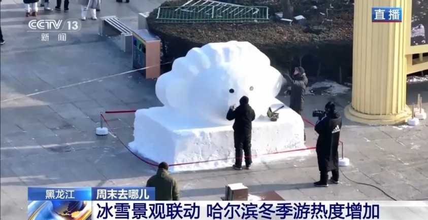 冬至时节,北方有吃饺子的习俗,景区特意用雪雕呈现了一个憨态可掬的“雪饺子”,该雪雕在3米×3米×2米的立方体上精雕细琢而成,雪雕老师还为其添上了眼睛和红脸蛋,赋予其独特的生命力,这是哈尔滨为游客送上的独特冬至祝福。