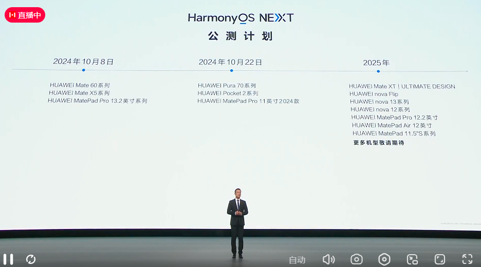 发布会上,华为宣布扩大HarmonyOS NEXT的公测范围,HUAWEI Pura 70系列、HUAWEI Pocket 2系列、HUAWEI MatePad Pro 11英寸2024款等机型于今日启动公测,用户可通过“我的华为”APP的“升级尝鲜”功能申请升级。此外,华为计划在2025年陆续为Mate XT、nova 13、nova 12等系列产品开启公测。