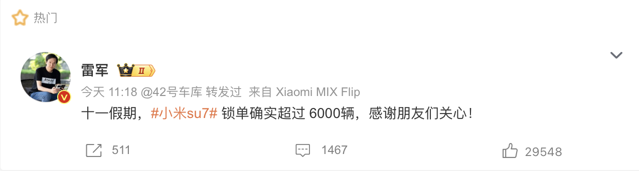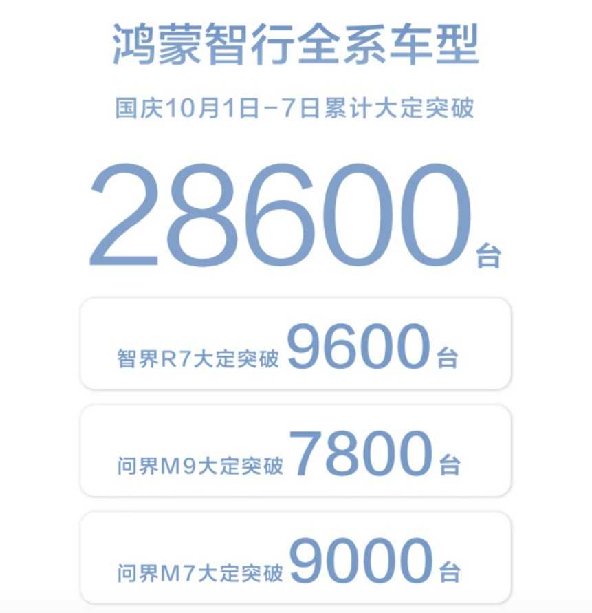多家车企纷纷发布十一假期销售喜报。零跑汽车CEO朱江明在朋友圈宣布,国庆假期零跑汽车销量创新高,7天大定超过1.7万辆。鸿蒙智行官方账号也宣布,国庆假期期间全系车型累计大定突破2.86万辆。小米创办人雷军则发布微博称,小米汽车SU7在十一假期锁单超过6000辆,目标10月交付2万辆。