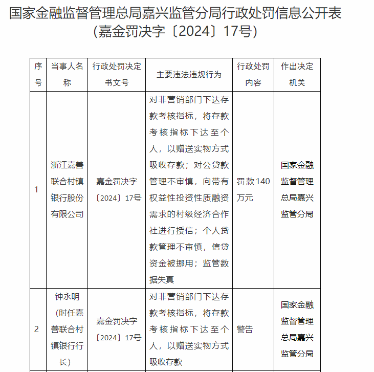 近日,浙江嘉善联合村镇银行因多项违法行为被罚款140万元,其中包括以赠送实物方式吸收存款、监管数据失真等。该行由杭州联合农村商业银行主发起设立,注册资本2亿元人民币,杭州联合银行持有40%股份。