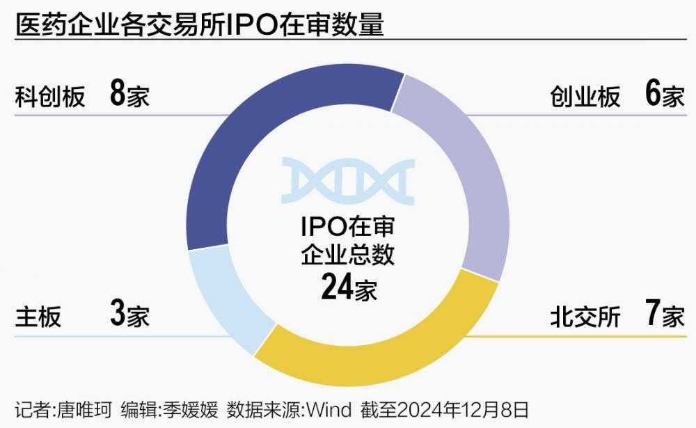 2024年,中国医药行业在资本市场的征程中历经波折,但寒冬中孕育着新生的希望。A股市场生物医药类企业的监管政策调整,IPO市场持续低迷,截至12月8日,仅有24家医药企业处于IPO在审状态,其中科创板8家,创业板6家,北交所7家,主板3家。港股市场则出现了医药企业私有化退市潮,但自10月起,港股IPO市场逐渐回暖。