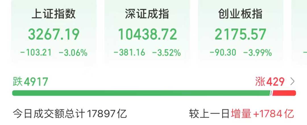 今天上午,市场临近收盘之际,指数出现快速下滑,午后跌幅进一步扩大。截至收盘,上证指数报收于负3.06%,深证成指下跌3.52%,而创业板指更是下跌3.99%。