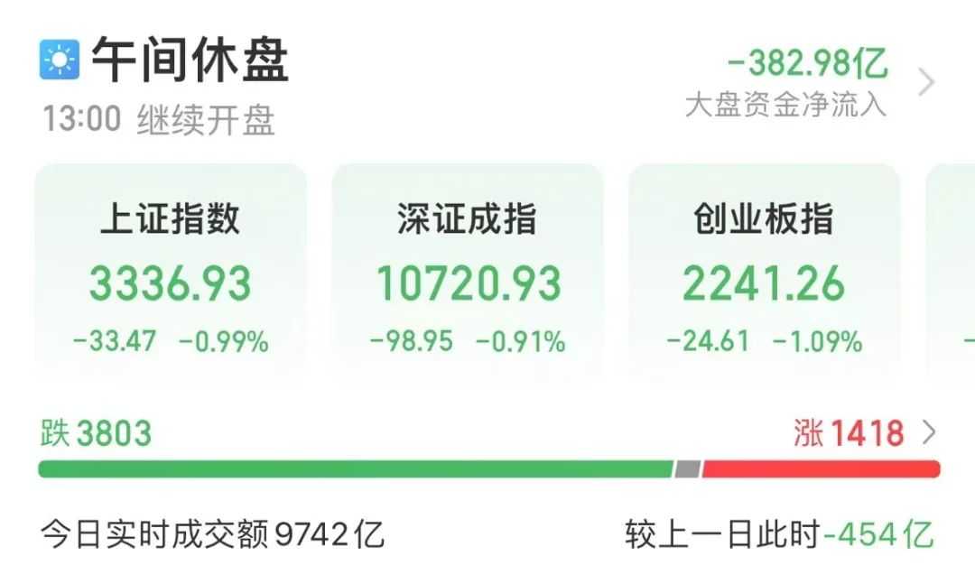 周五,A股市场三大指数集体低开,随后维持弱势震荡。截至午间收盘,上证指数报收于某点位,下跌0.99%;深证成指报收于某点位,下跌0.91%;创业板指报收于某点位,下跌1.09%。成交量方面,A股半日成交额为9742亿元,较上一个交易日同期缩量454亿元,市场交投活跃度有所降低。