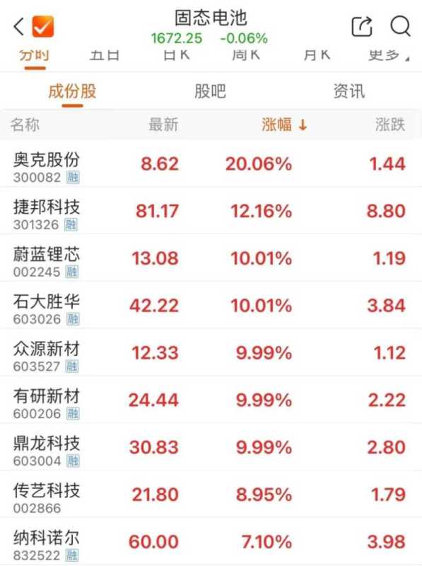 固态电池概念股近期反复活跃,今日午前再度回升。奥克股份以20%幅度涨停,捷邦科技涨超10%,蔚蓝锂芯、石大胜华、众源新材、有研新材等涨停。这一波行情的上涨,主要得益于固态电池技术的不断突破以及市场对固态电池商业化进程的加速。