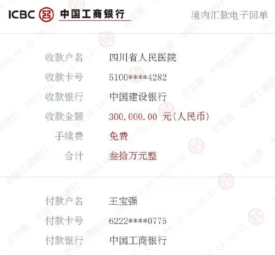 2. 刘勇还透露,在恩波生病并考虑放弃治疗时,王宝强亲自飞往成都探望,并慷慨支付了30万的医疗费用,同时附上了王宝强的付款截图作为证据。