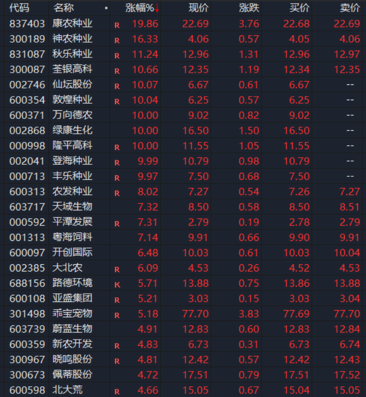 农业股成为当日A股市场上的明星板块,截至收盘,登海种业、丰乐种业、万向德农、敦煌种业、仙坛股份等近10只个股涨停或涨幅超过10%,农发种业涨幅超过8%,天域生物、粤海饲料涨幅超过7%,大北农、开创国际涨幅超过6%。