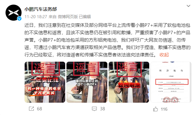 近期,多家车企法务部纷纷采取行动,打击不实信息传播。11月20日,小鹏汽车法务部发布消息称,针对社交媒体及网络平台上流传的小鹏P7+采用软包电池包的不实信息和谣言,已取证并将对造谣者和传播不实信息者依法追究法律责任。11月6日,比亚迪网络举报中心发布消息称,正式起诉汽车自媒体人“管学军”,因其长期发布针对比亚迪的不实及恶意诋毁信息。此外,蔚来和理想汽车法务部也分别表示,已采取法律行动打击恶意攻击和诽谤行为。