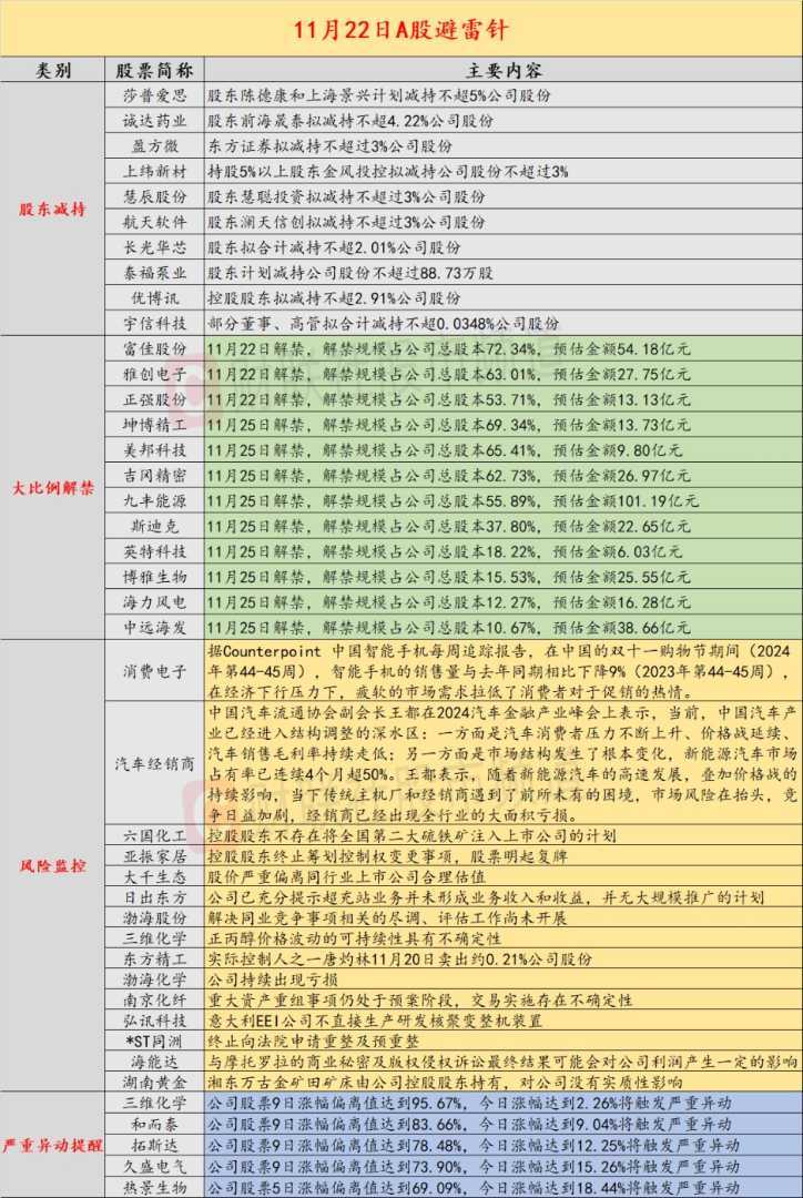 导读:财联社11月22日发布投资避雷针,A股及海外市场潜在风险事件概览。国内经济信息方面,机构报告显示2024年双十一中国智能手机销量同比下滑9%;中汽协副会长指出,经销商面临全行业大面积亏损。公司预警方面,六国化工澄清控股股东无注入硫铁矿计划;亚振家居控股股东终止控制权变更,股票复牌。海外市场,纳斯达克中国金龙指数收跌,热门中概股走低;拼多多三季度营收超预期但股价下跌。